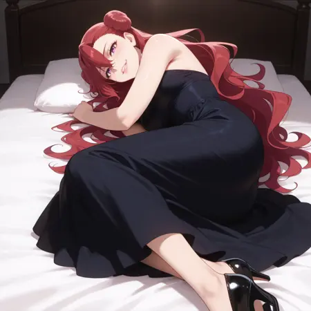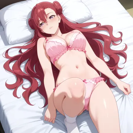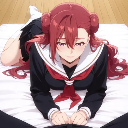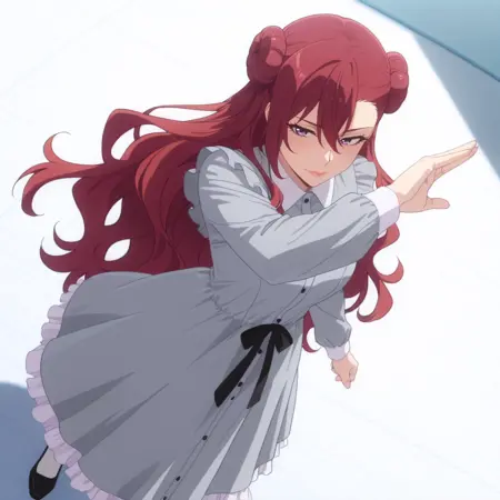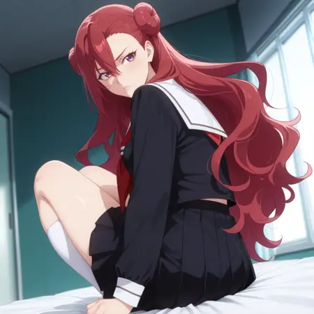 SatomiTsubaki、紫の目、赤い髪、非常に長い髪、髪の結び目、二重の結び目、目の間の髪、非対称な前髪、波打つ髪、