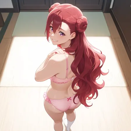 SatomiUnderwear、下着のみ、ピンクのブラ、フリル付きブラ、ピンクのパンツ、フリル付きパンツ、リボン付きパンツ、白い靴下、
