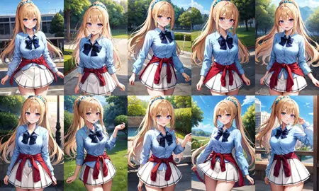 衣装1aakei, long hair, blonde hair, ponytail, hair scrunchie, blue bowtie, collared shirt, blue shirt, sleeves rolled up, clothes around waist, pleated skirt, white skirt