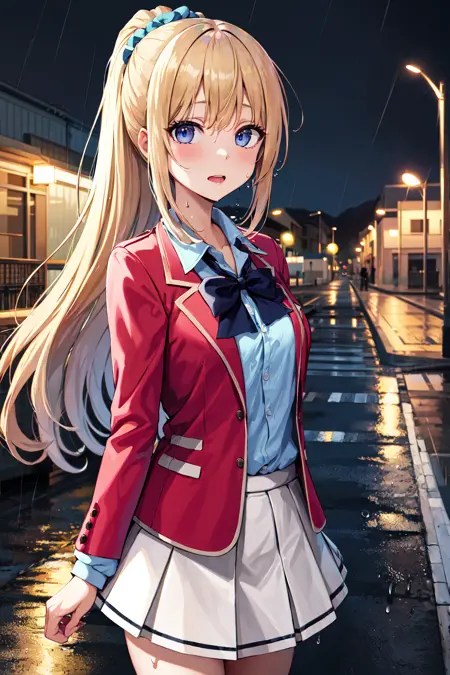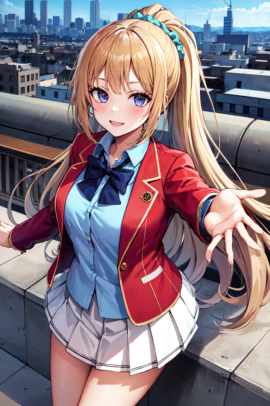 衣装2bbkei, long hair, blonde hair, ponytail, hair scrunchie, collarbone, blue bowtie, collared shirt, blue shirt, red jacket, blazer, open jacket, long sleeves, pleated skirt, white skirt