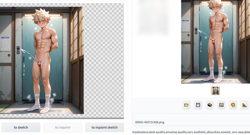 如果你从远处绘制,比如全身像,私密部位可能需要额外的细节。可以尝试使用 ADetailer 工具,如 阴茎检测 或 阴茎-阴户ADetailer模型 来增强阴茎细节,或者若想获得更精确的控制,可采用手动修补。有时 ADetailer 无法正确识别未割包皮的包茎外观,或使图像变得杂乱——此时手动修补是最佳选择。