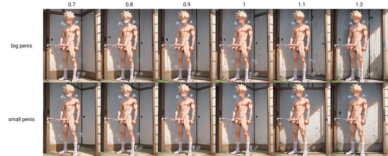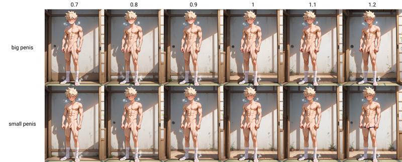 该 LoRA 特别适合绘制疲软状态的阴茎,因为这正是其核心概念(即使 LoRA 强度低至 0.6 也能获得出色效果,但我建议使用 >0.8)。但你同样可以生成半勃起或完全勃起的状态——只需将 LoRA 强度提高至约 1.2,以使包皮完全覆盖龟头。