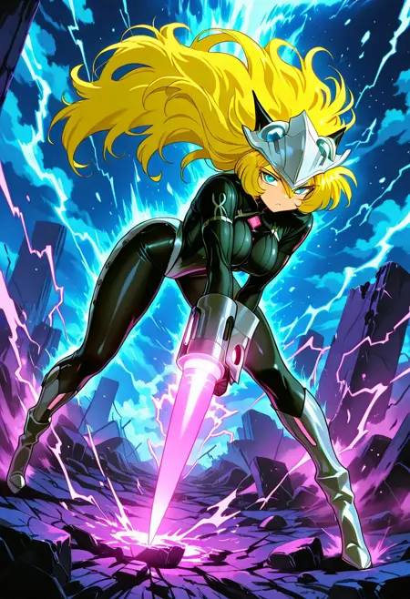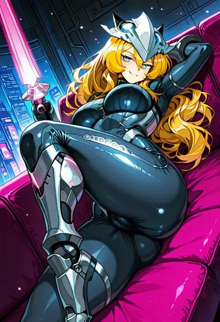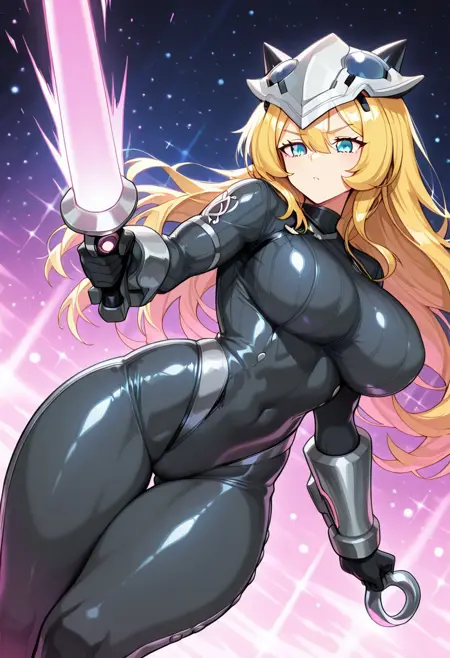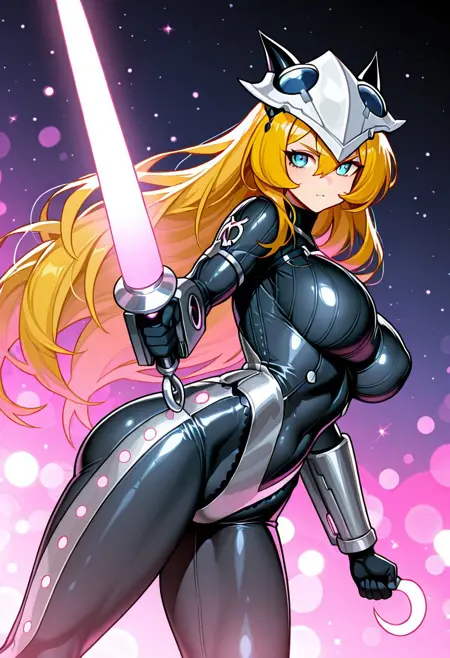 AlienMagmaMS, 1소녀, 솔로, 몬스터 걸, 인격화, 곡선형 몸매, 금발, 긴 머리, 앞머리, 파란 눈, 뿔이 달린 흰색 후드 형태의 머리 장식, 과학적 판타지 스타일의 스판 수트, 검은 라텍스 바디수트, 큰 가슴, 큰 둥근 엉덩이, 넓은 골반, 왼손에 그랩링 후크, 오른손에 분홍색 빛나는 에너지 검, 기계 부품이 달린 팔보호대, 은색 갑옷, 은색 부츠,