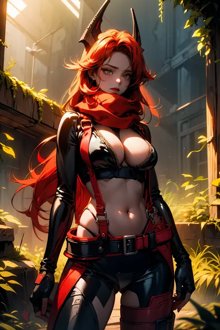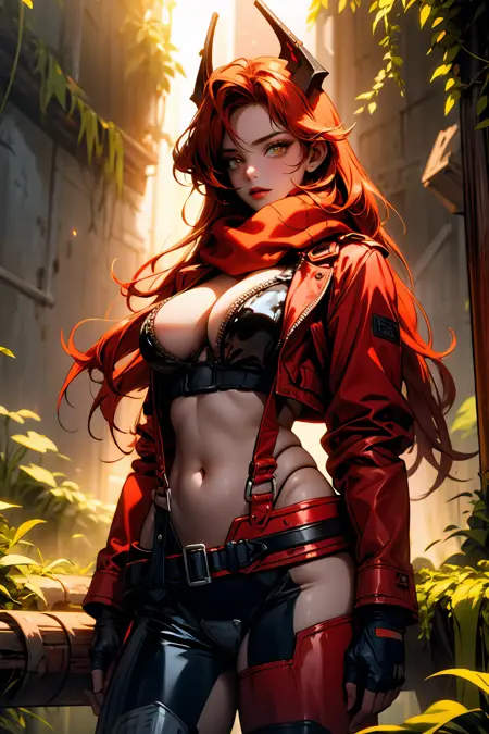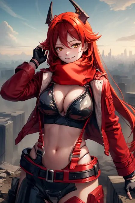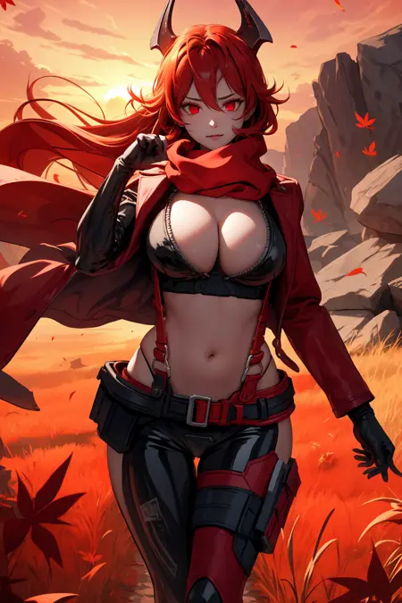 衣装 - 赤いジャケット, 短めのジャケット, 赤いスカーフ, ジッパーを開けたボディスーツ, サスペンダー, 黒いズボン, ベルト, 指なし手袋, 非対称な脚元, ヒップベンツ, 腹部, ハイヒールブーツ