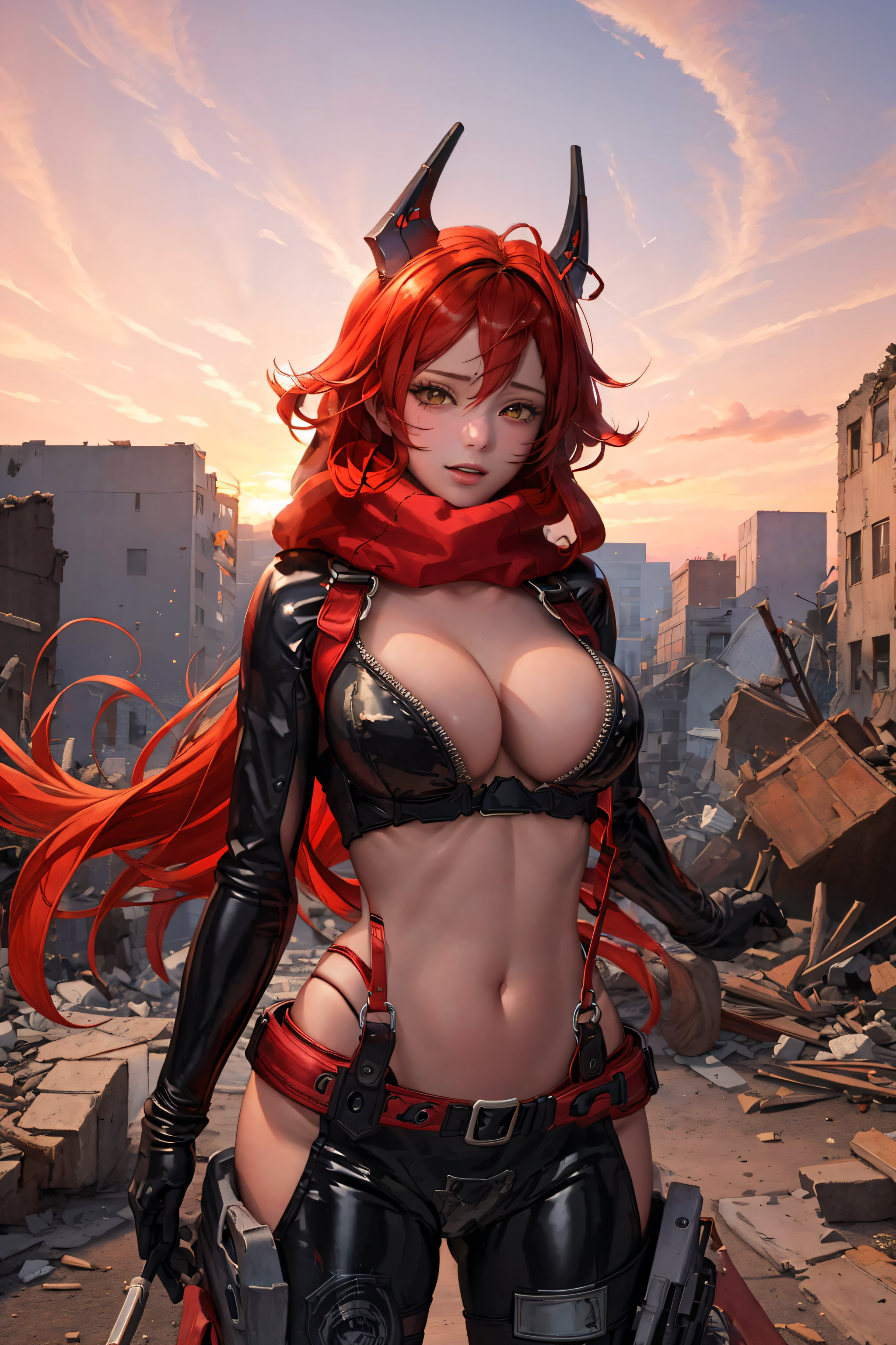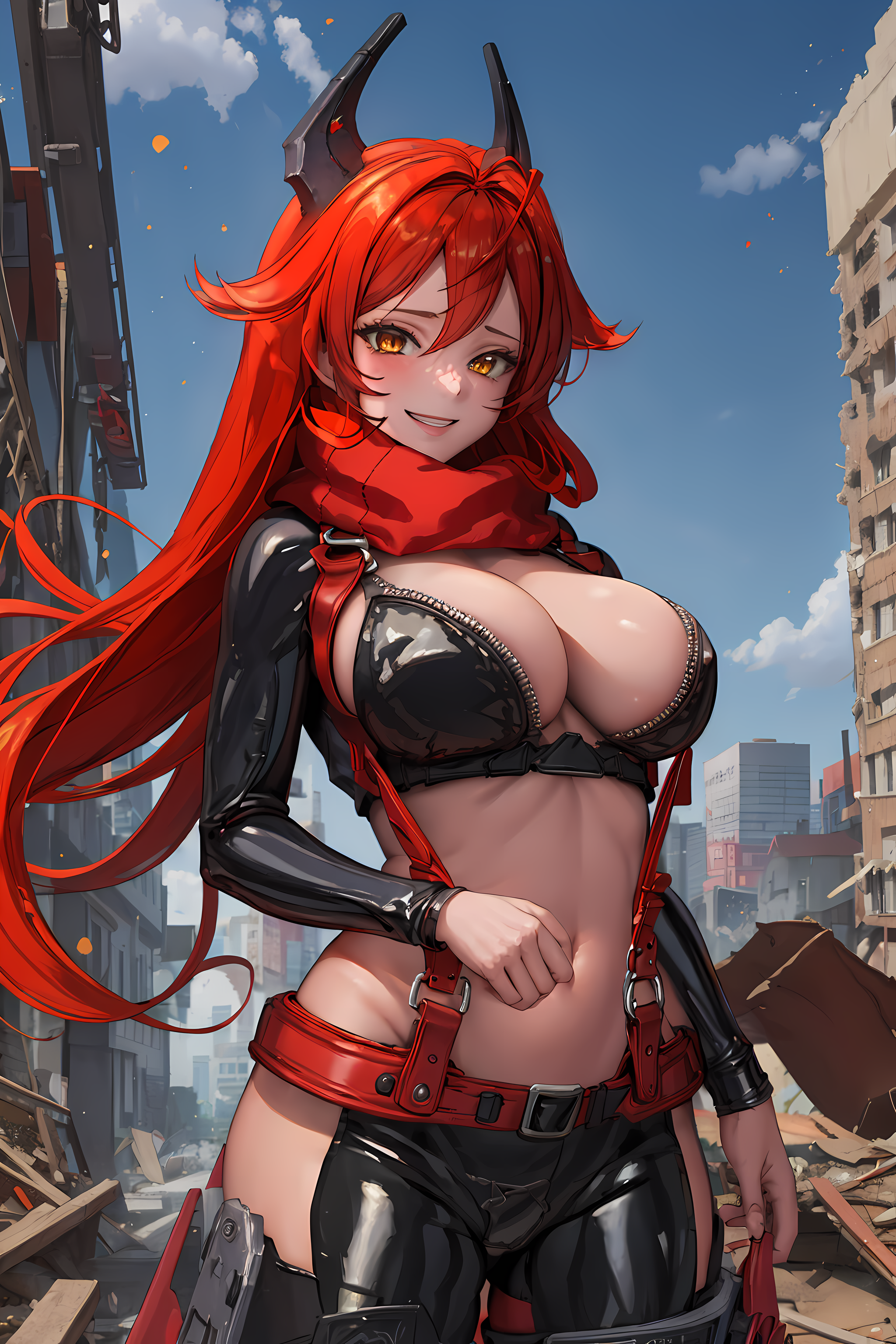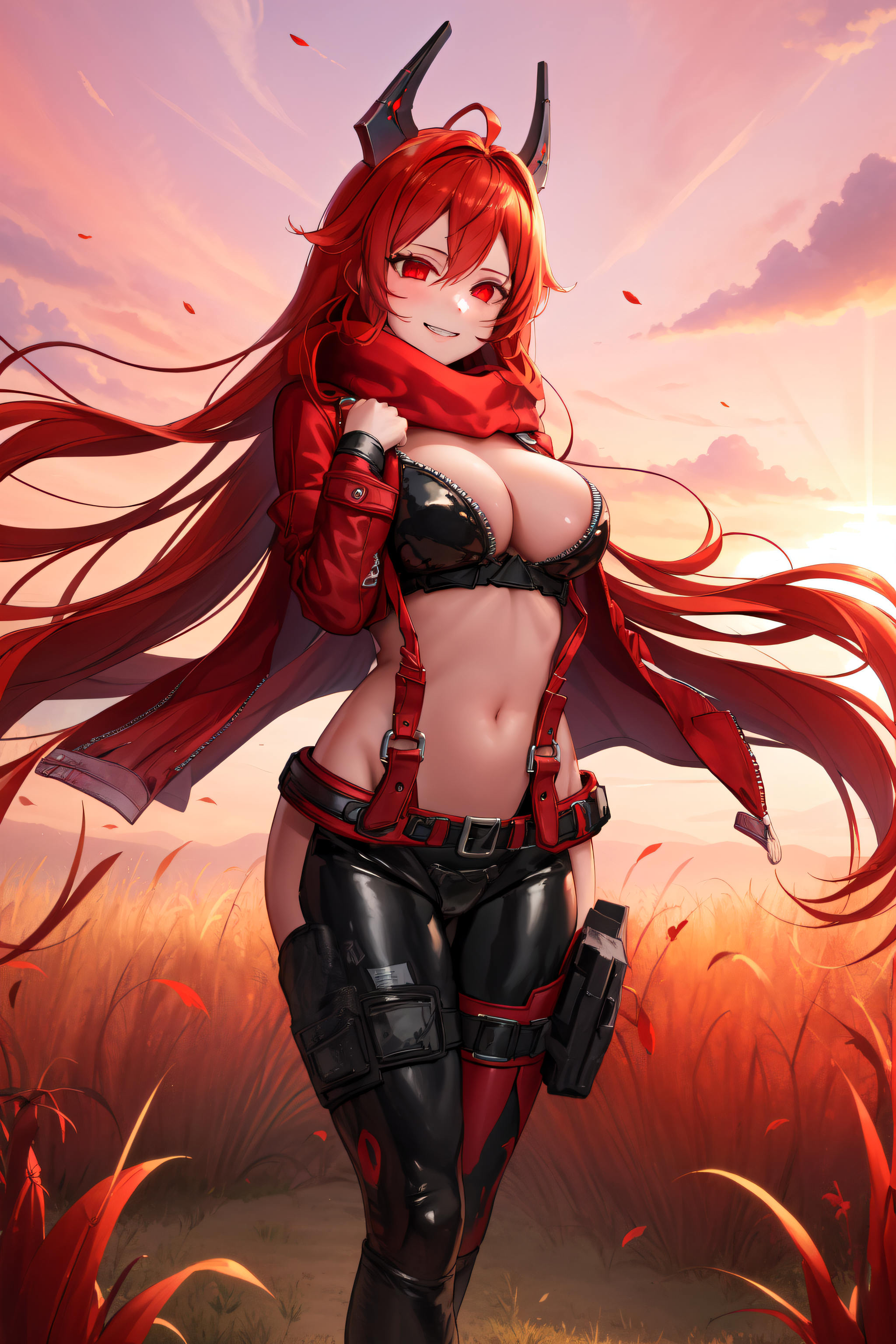 • Outfit - red jacket, cropped jacket, red scarf, unzipped bodysuit, suspenders, black pants, belt, fingerless gloves, asymmetrical legwear, hip vent, midriff, high heel boots