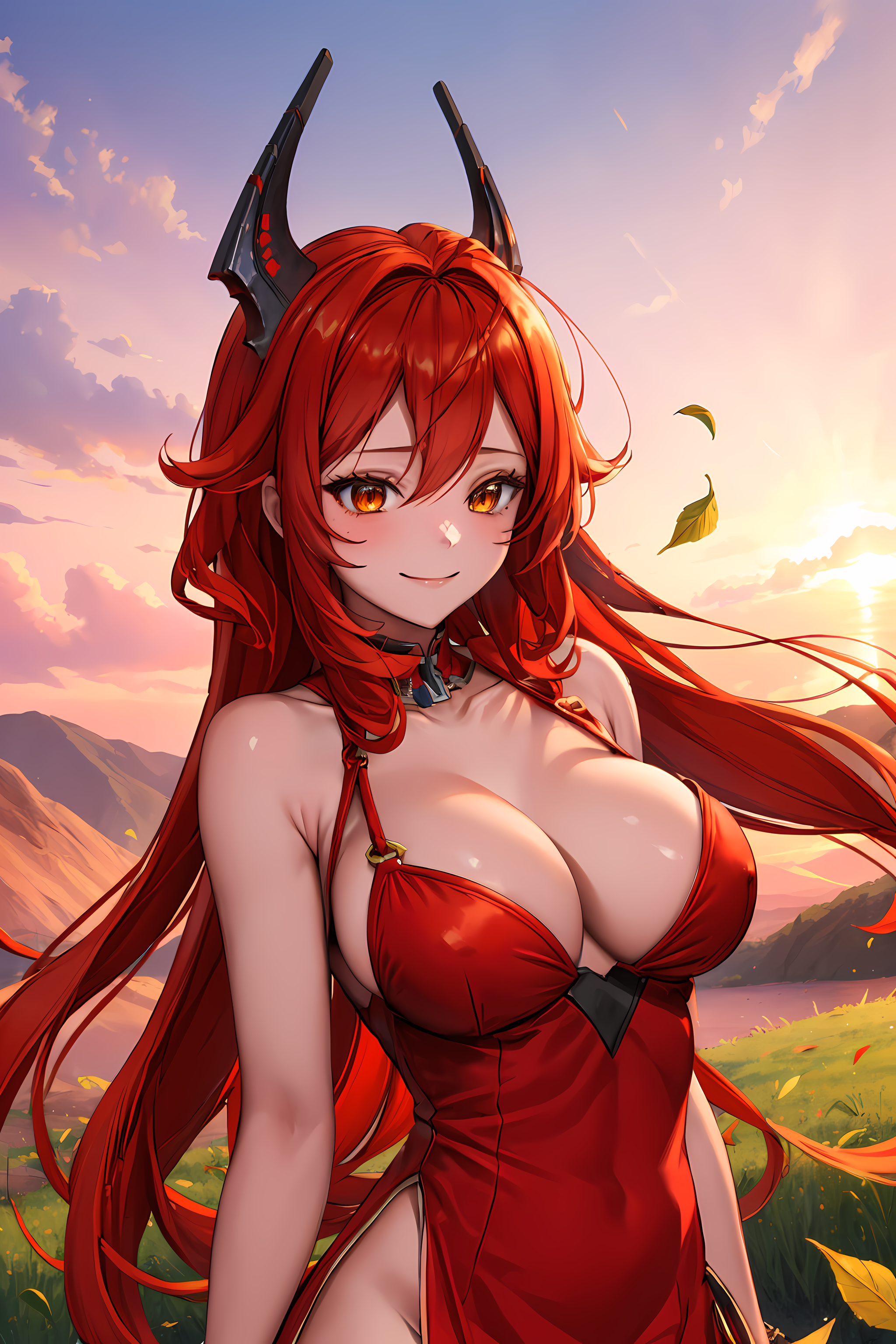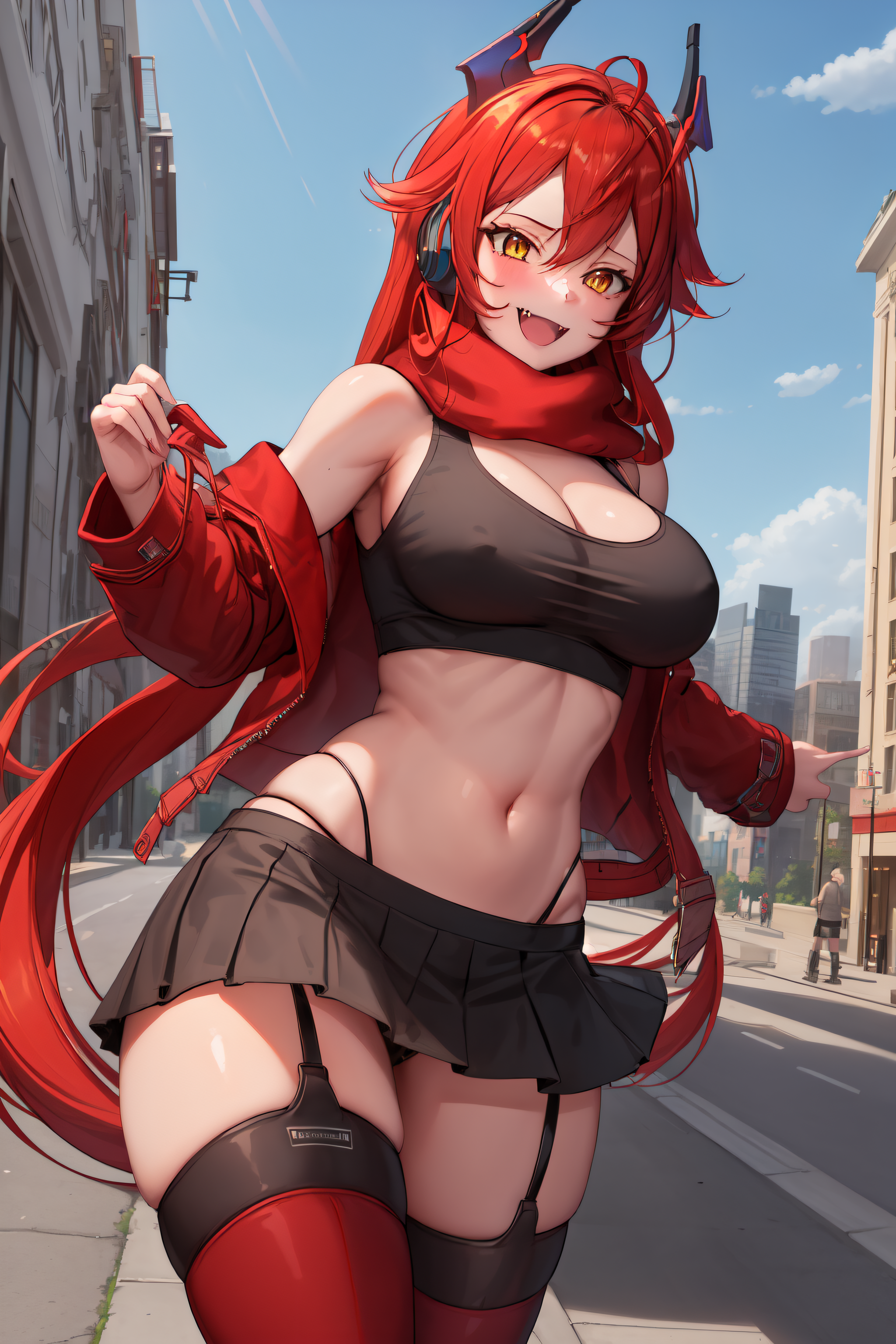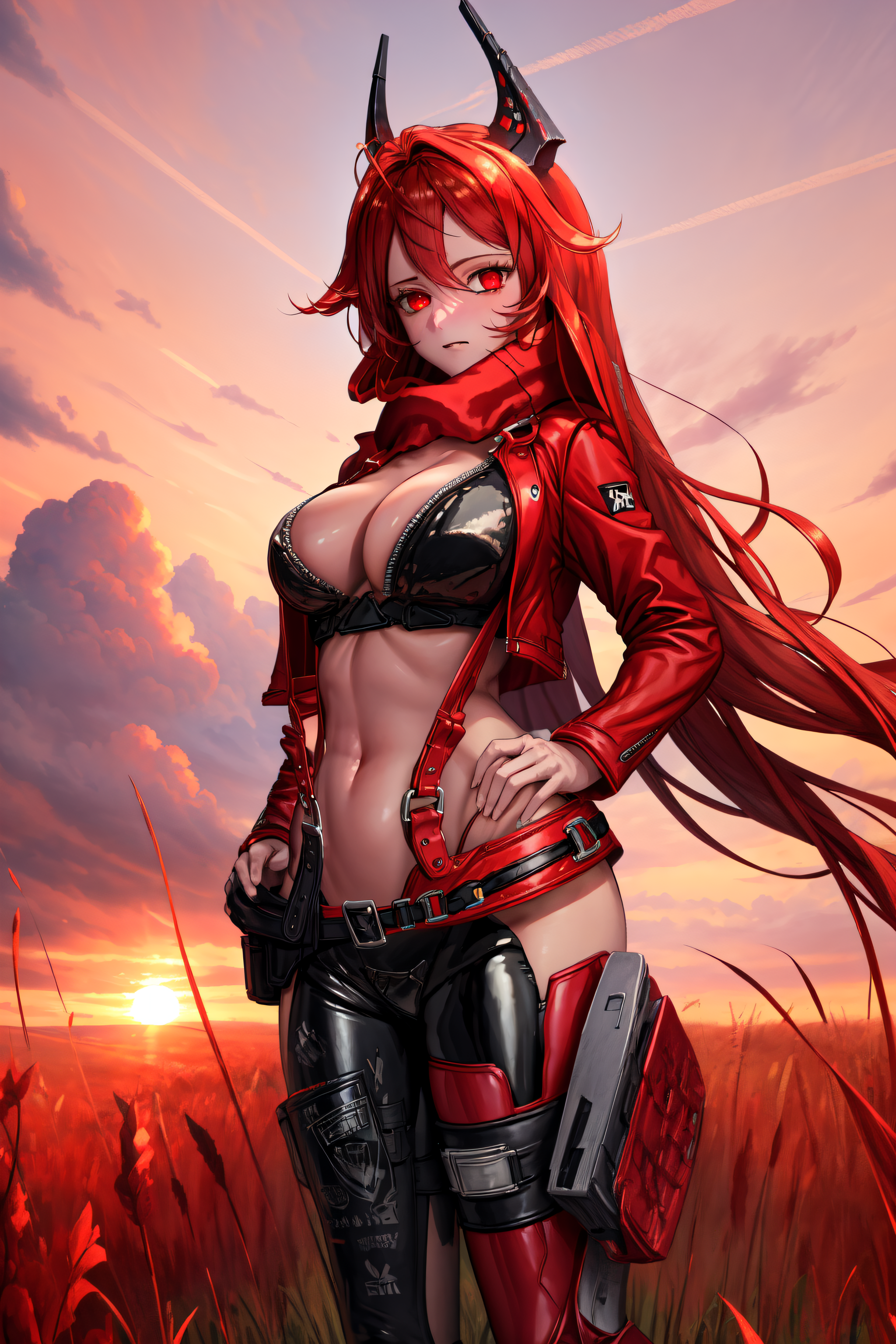 • Outfit - red jacket, cropped jacket, red scarf, unzipped bodysuit, suspenders, black pants, belt, fingerless gloves, asymmetrical legwear, hip vent, midriff, high heel boots