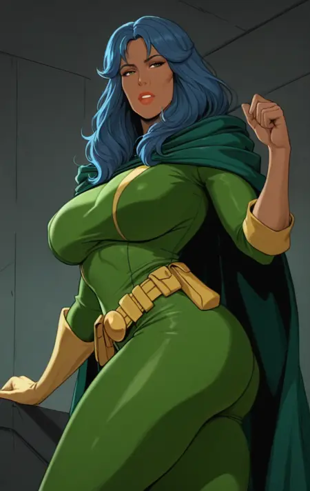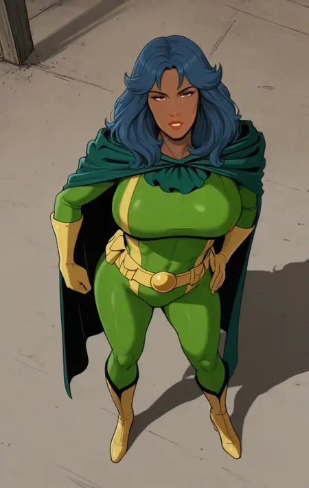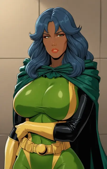 1girl, solo, long hair, looking at viewer, blue hair, black hair, coat, dark skin, lips, black coat, dark-skinned female, green cape,green cape, hand on face, yellow belt, green outfit,s1lv3rf0x,