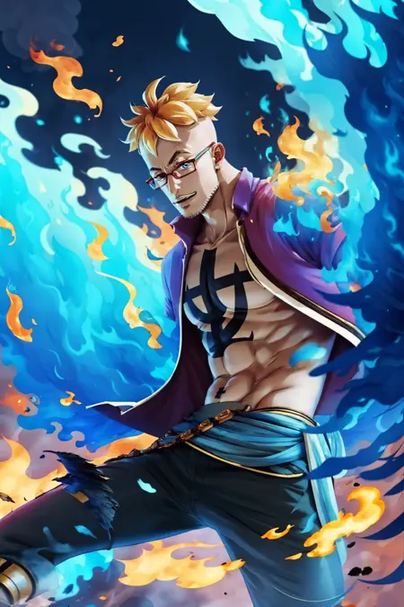 This lora work best at 0.8-1.0, higher weight for detail accuracy, it got 3 forms: marco_base, marco_hybrid and marco_zoan, tattoo can be incorrect sometimes. You can prompt for glasses if you want; you can also pick sandals or talons for his hybrid form, but talons can be easily messed up just like fingers, so sandals is recommended.