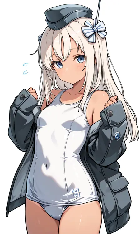 夏季服装: U511summerKC,灰金色头发,长发,长袖,帽子,泳装,发带,露装,敞开夹克,连体泳衣,遮盖肚脐,校服泳装,古铜色,灰色夹克,白色连体泳衣,衣内泳装,军帽,发饰,黑色夹克