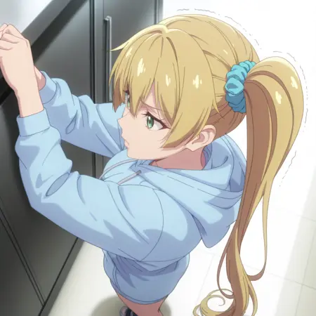 KireiKisegawa, 녹색 눈, 금발 머리, 눈 사이의 머리, 머리 장식, 매우 긴 머리, 사이드 테일, 파란색 머리끈,
