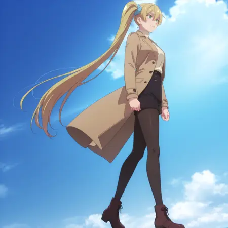 KireiCoat, 터틀넥 스웨터, 갈색 코트, 오픈 코트, 긴 소매, 검은 반바지, 허리 높은 반바지, 검은 팬티스타킹,