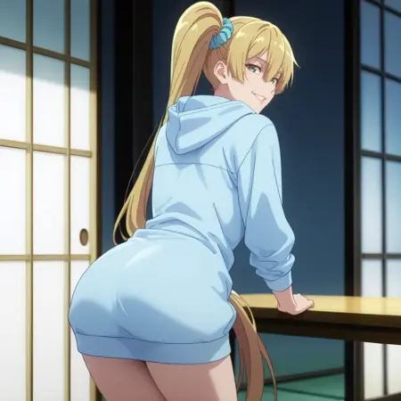 KireiHoodie, 파란 후디, 오버사이즈 후디, 후드 내려짐, 다리 노출, 하의 없음,