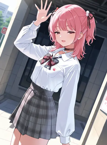 bone pendant choker, white shirt, shirt tucked in, bowtie, plaid pleated skirt,または