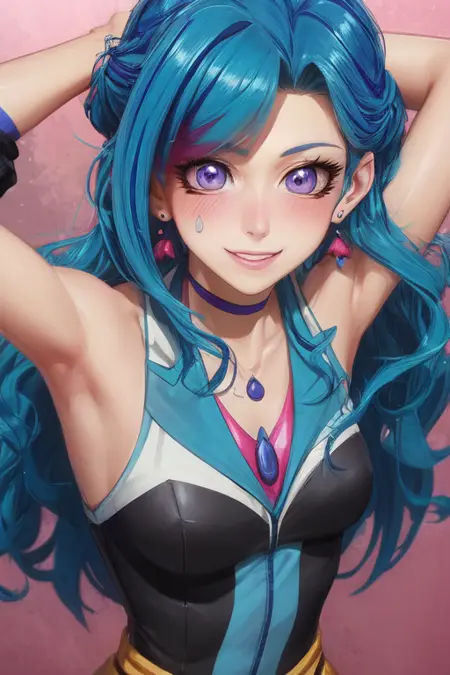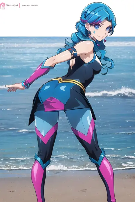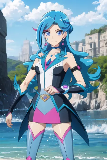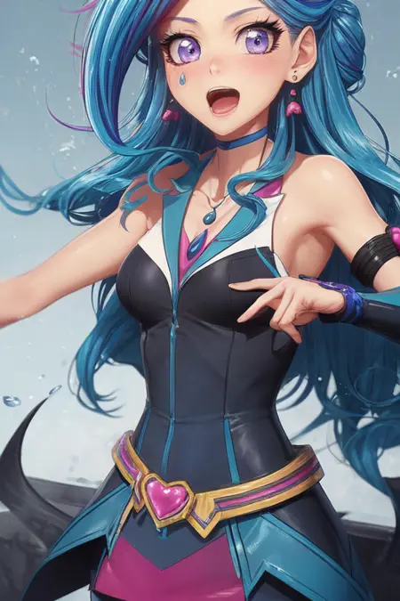 BMD, 1girl, long hair, blue hair, water tattoo, choker, jewelry, earrings, smile, boots, blue eyes, pantyhose, pink heart earring,