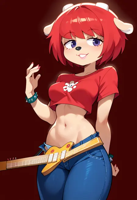 触发词:lammy_umm,短发,动物耳朵,毛茸茸的女性,红发女性,胸部,红色上衣,露脐装,牛仔裤