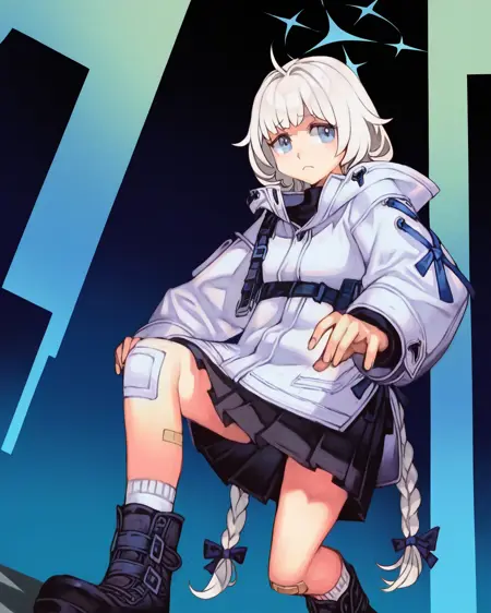 halo, blue eyes, white hair, short hair, ahoge, low twin braids, bangs, hair bow,
