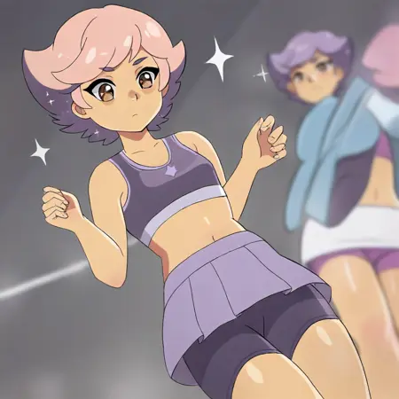 gl1m3r, pink hair, short hair, sparkle, brown eyes,sparkle cape,fingerless gloves,sleveless gloves,shoulder pad ,elbow_sleeve