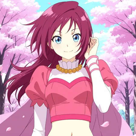 衣装:パールネックレス、クラップトップ、ピンクのマント
