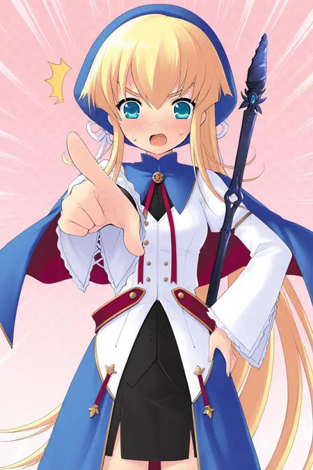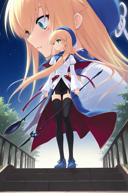 magical girl,beret,blue headwear,hat ribbon,white ribbon,turtleneck,blue capelet,v-neck,brooch,neck ribbon,red ribbon,black shirt,buttons,white dress,juliet sleeves,long sleeves,wide sleeves,frilled sleeves,armband,red belt,blue skirt,waist skirt,wrap skirt,long skirt,layered skirt,black skirt,pencil skirt,miniskirt,pelvic curtain,side slit,zettai ryouiki,black thighhighs,sneakers,blue footwear,cross-laced footwear,