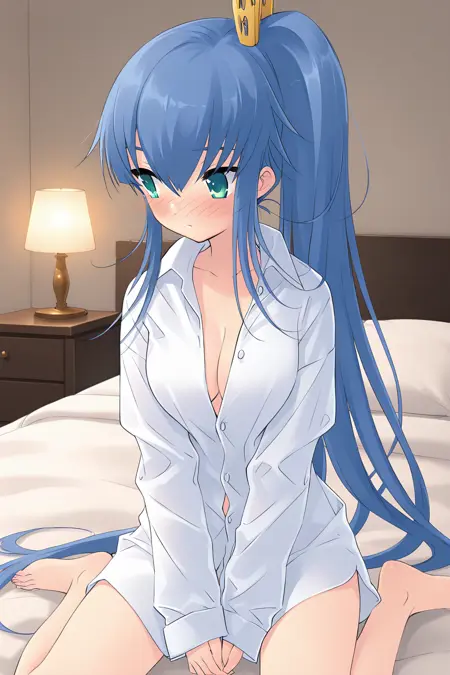 yuuki nona,green eyes,aqua eyes,blue hair,very long hair,thick eyebrows,hair between eyes,sidelocks,side ponytail,high ponytail,hairclip,