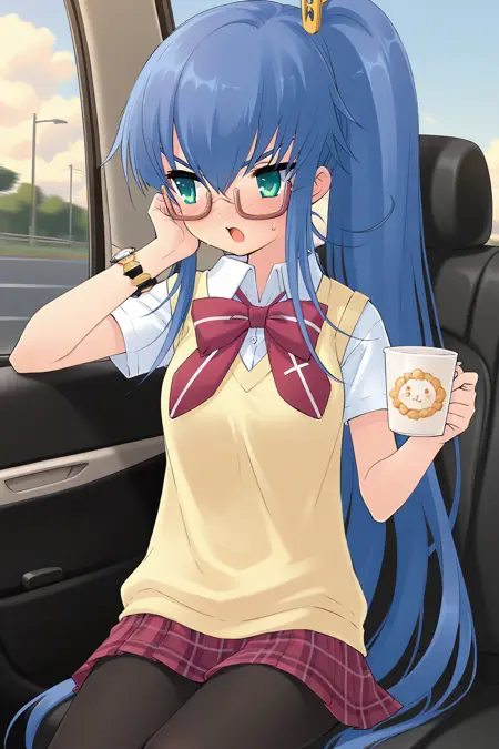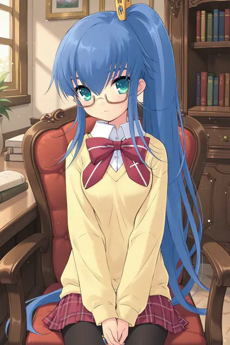 yuuki nona,green eyes,aqua eyes,blue hair,very long hair,thick eyebrows,hair between eyes,sidelocks,low twintails,yellow ribbon,hair over breasts,