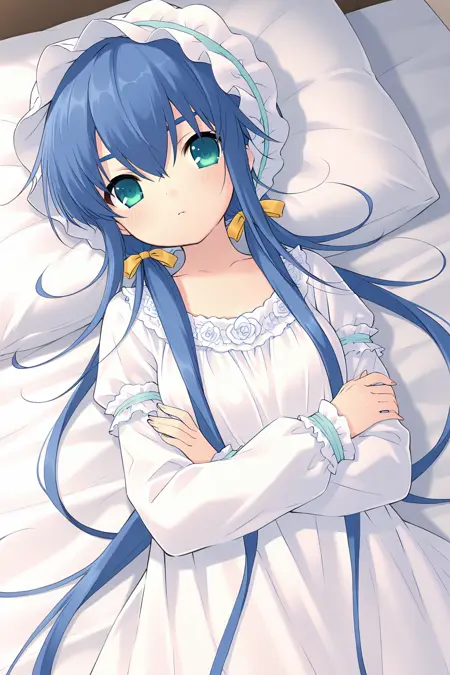 pajamas,bonnet,white headwear,blue ribbon,hat ribbon,white negligee,frilled negligee,collarbone,flower collar,white rose,square neckline,puffy sleeves,long sleeves,armband,sleeve ribbon,