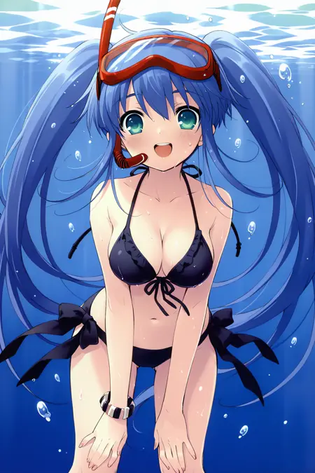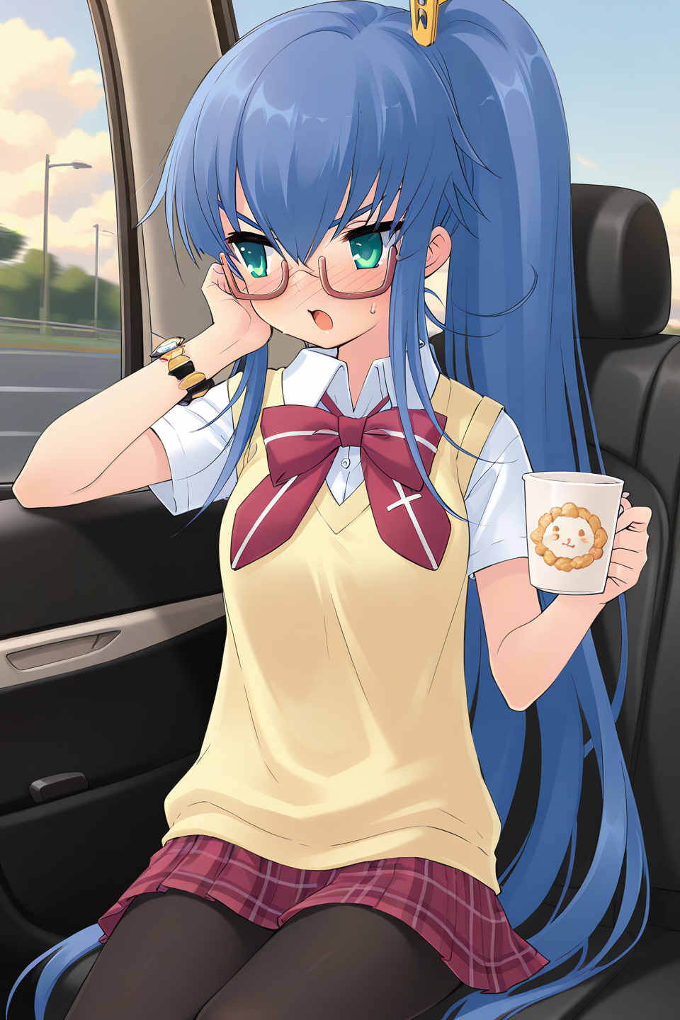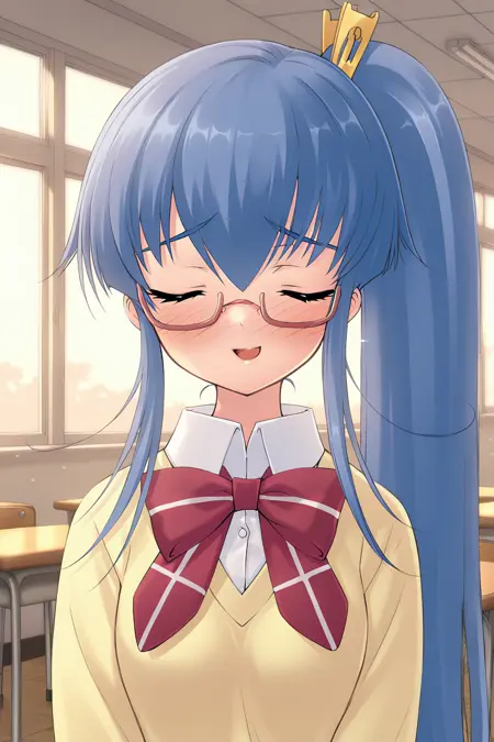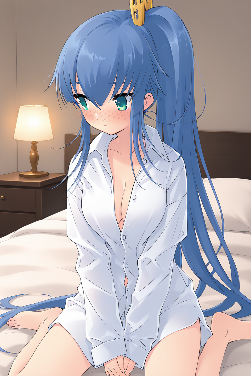 yuuki nona, green eyes, aqua eyes, blue hair, very long hair, thick eyebrows, hair between eyes, sidelocks, side ponytail, high ponytail, hairclip,