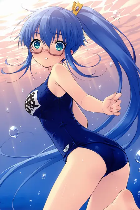 school swimsuit, blue one-piece swimsuit, old school swimsuit, name tag, kanji, character name, bare shoulders, barefoot,