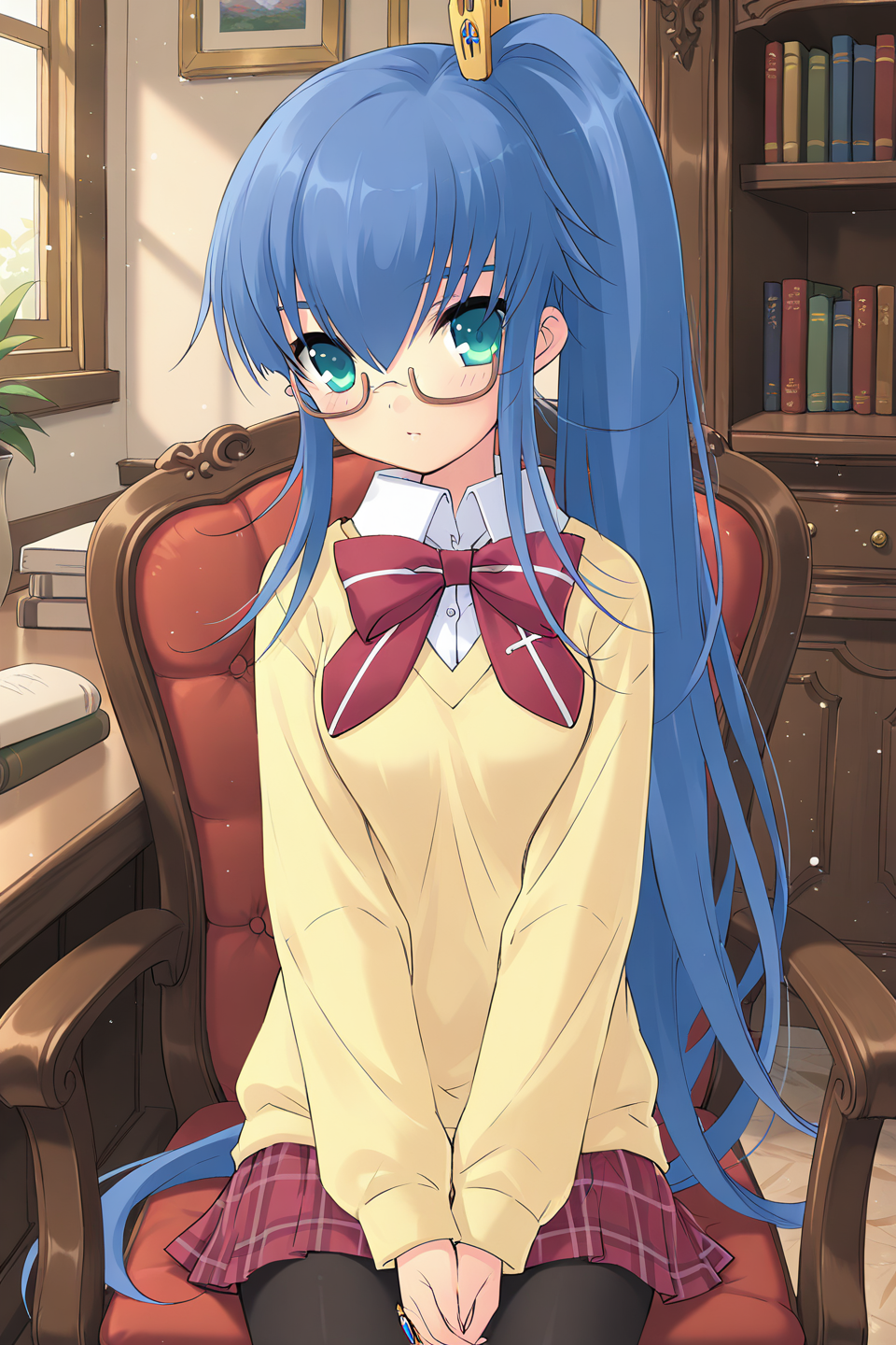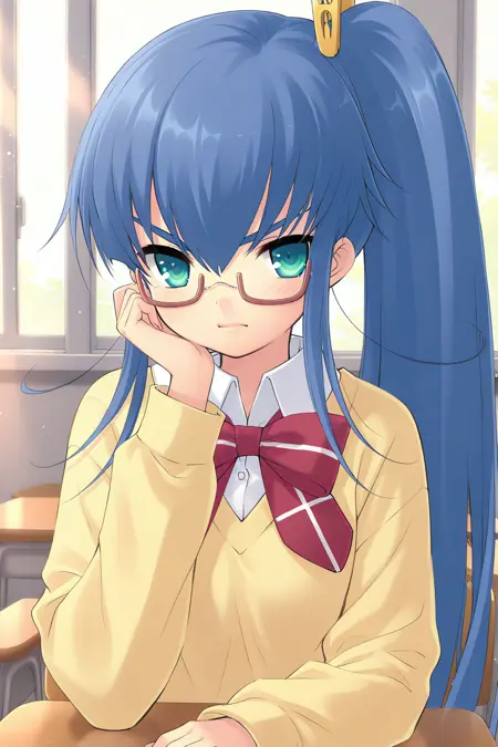 yuuki nona, green eyes, aqua eyes, blue hair, very long hair, thick eyebrows, hair between eyes, sidelocks, low twintails, yellow ribbon, hair over breasts,