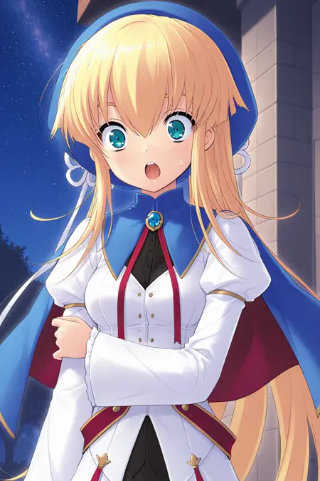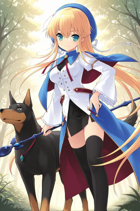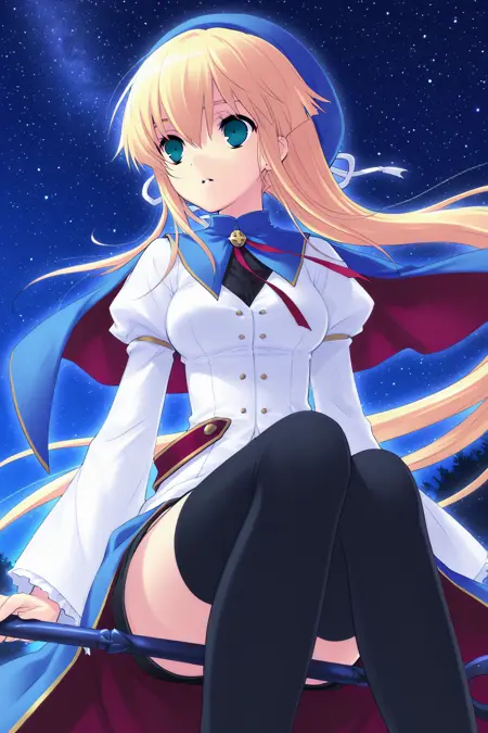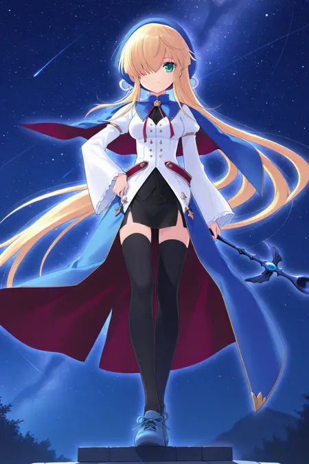 마법소녀, 베레트, 파란 헤드웨어, 모자 리본, 흰 리본, 터틀넥, 파란 캐프레, V자 네크라인, 브로치, 목 리본, 빨간 리본, 검은 셔츠, 단추, 흰 드레스, 줄리엣 소매, 긴 소매, 넓은 소매, 주름 소매, 팔찌, 빨간 끈, 파란 치마, 허리 치마, 감싸는 치마, 긴 치마, 층층이 치마, 검은 치마, 연필 치마, 미니 치마, 골반 커튼, 옆 절개, 절대 영역, 검은 허벅지양말, 스니커즈, 파란 신발, 십자가 끈 신발,