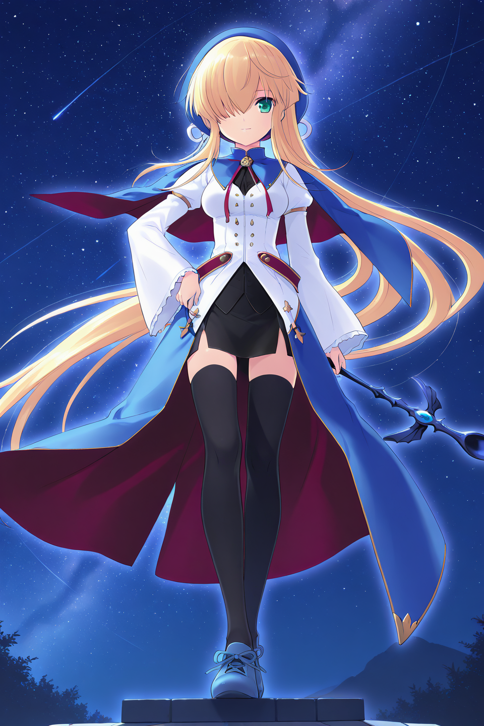 magical girl, beret, blue headwear, hat ribbon, white ribbon, turtleneck, blue capelet, v-neck, brooch, neck ribbon, red ribbon, black shirt, buttons, white dress, juliet sleeves, long sleeves, wide sleeves, frilled sleeves, armband, red belt, blue skirt, waist skirt, wrap skirt, long skirt, layered skirt, black skirt, pencil skirt, miniskirt, pelvic curtain, side slit, zettai ryouiki, black thighhighs, sneakers, blue footwear, cross-laced footwear,