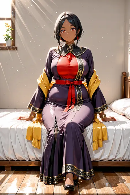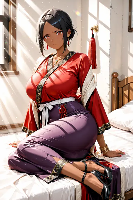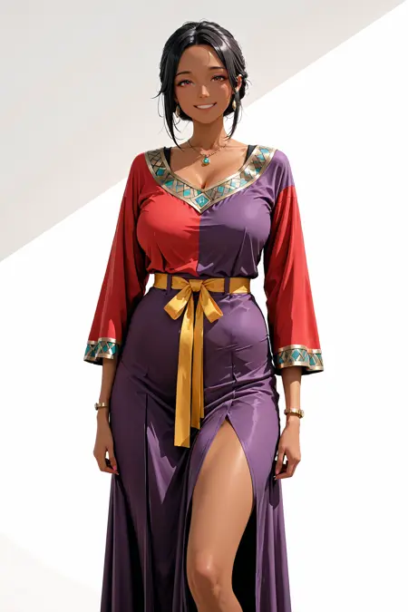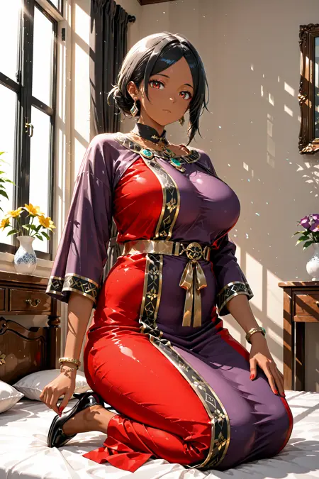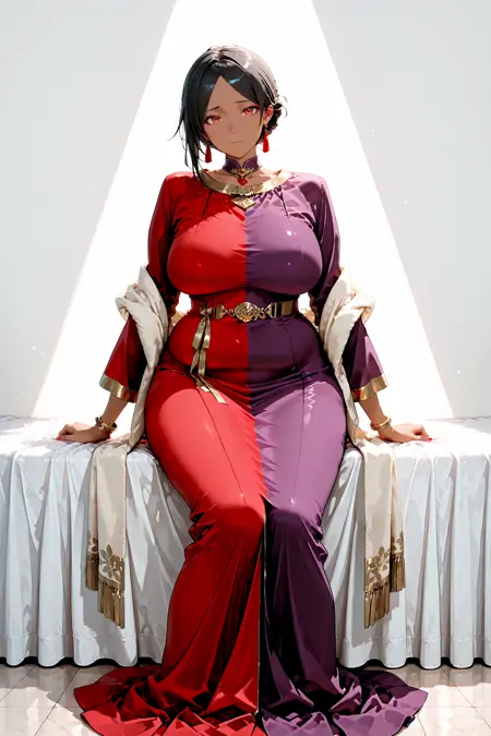 옷과 피부 톤을 더 일관되게 얻고 싶다면, "two-tone sari, red dress, purple dress, dark skin"과 같은 프롬프트를 추가하는 것이 좋습니다.
