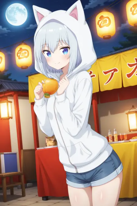 animal hood, cat hood, hoodle, white hoodle, light blue pajamas, animal ears, car ears, fake animel ears, buttons, hood up, long sleeves, light blue short shorts