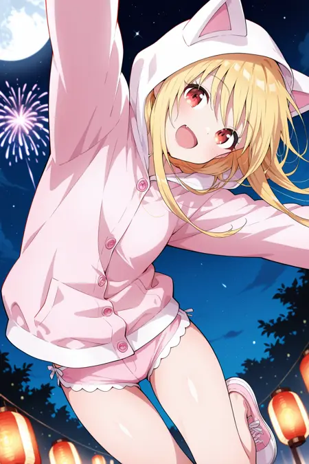 animal hood, cat hood, hoodle, white hoodle, pink pajamas, animel ears, cat ears, fake animal ears, buttons, hood up, long sleeves, pink short shorts