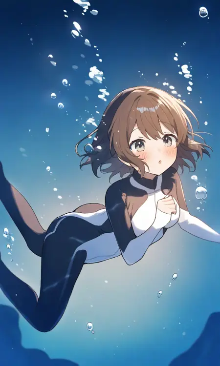 1woman, freediving, skinny_dipping, nude, nudist, swimming, (underwater), air_bubble, bubble, blue, submerged, blush