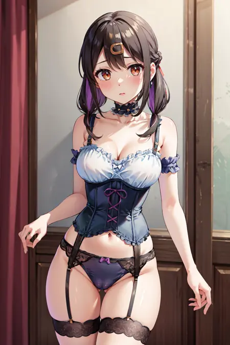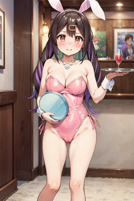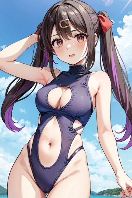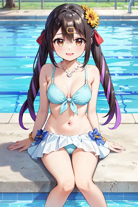 - ccmihari,긴 머리,다색 머리카락,트윈테일,앞머리,눈 사이의 머리카락,헤어클립,꽃 모양 헤어 액세서리,헤어 리본,목걸이,비키니,앞쪽 매듭 비키니 상의,손목 스런치,흰 비키니 스커트,발목줄,맨발