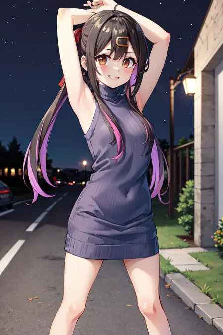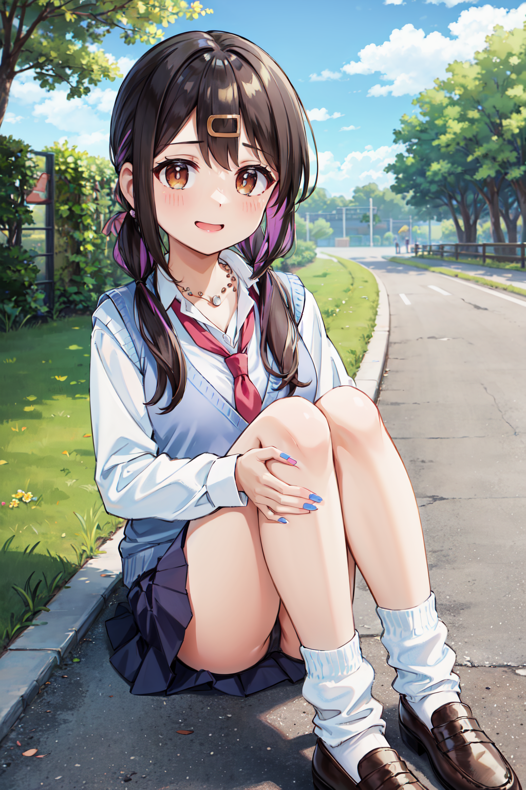- bbmihari,ギャル,긴 머리,다색 머리카락,헤어클립,목걸이,낮은 트윈테일,헤어 장식,교복,스웨터 베스트,흰 셔츠,넥타이,네일 폴리시,스커트,긴 소매,셔츠,(흰 여유 있는 양말:1.2),로퍼