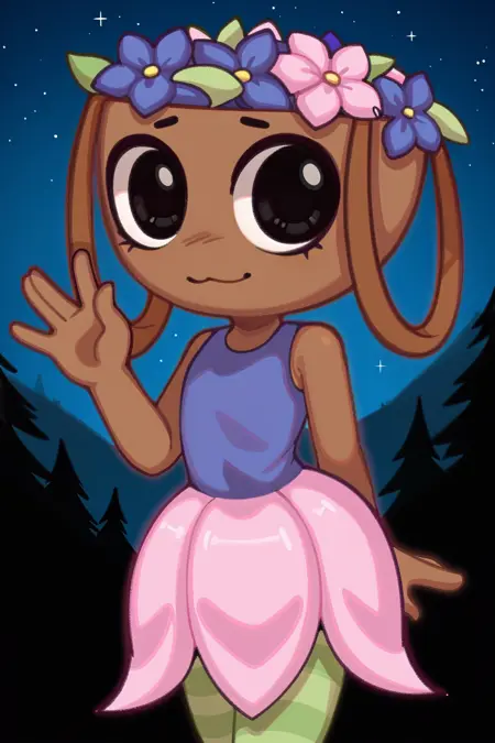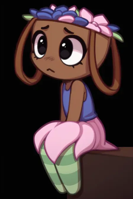 Helpful: 1girl, anthro, object head, basket head, loop ears, floppy ears, flowers in head, sleeveless top, petal skirt, striped thighhighs black eyes, noseless