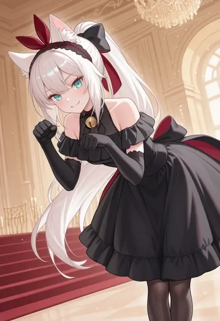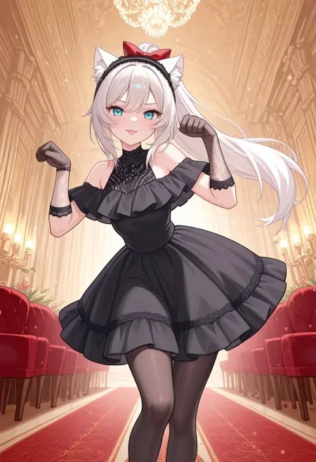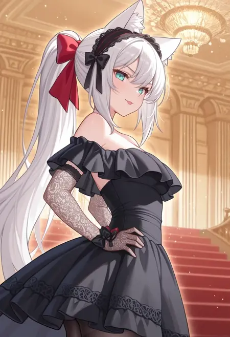 동물 귀, 동물 귀 털, 레이스 테두리 헤어밴드, 포니테일, 검은 스타킹, 검은 드레스, 피쉬넷 장갑, 검은 활, 빨간 활, 헤어 활, 어깨 드레스,