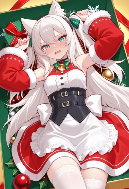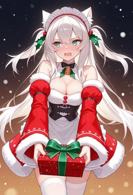 동물 귀, 동물 귀 털, 양측 올림, 메이드 헤드디자인, 산타 복장, 앞치마, 흰색 허벅지 스타킹, 언더버스트, 어깨 노출, 분리형 소매, 모피 테두리 소매, 가슴 노출, 목 벨,