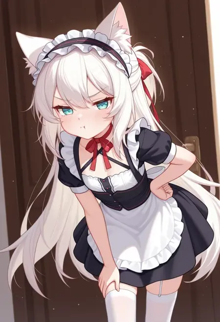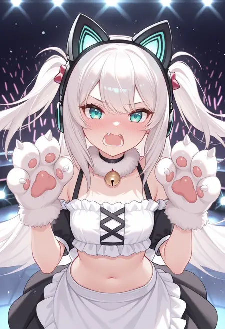 고양이 귀 헤드폰, 양측 올림, 검은 동물 손, 모피 목걸이, 어깨 노출, 볼륨감 있는 짧은 소매, 링링벨, 허리 노출, 흰색 앞치마, 검은 치마, 프릴 셔츠, 흰색 허벅지 스타킹,