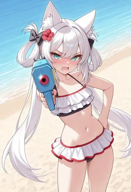 동물 귀, 동물 귀 털, 프릴 비키니, 흰색 비키니 치마, 검은 비키니 하의, 헤어 링, 트윈테일, 검은 리본, 헤어 장미, 헤어 활, 빨간 테두리,