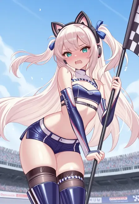 고양이 귀 헤드폰, 양측 올림, 브라이덜 장갑, 크롭 탑, 레이스 퀸, 짧은 반바지, 검은 허벅지 스타킹, 파란 허벅지 부츠, 헤어 리본, 파란 리본,