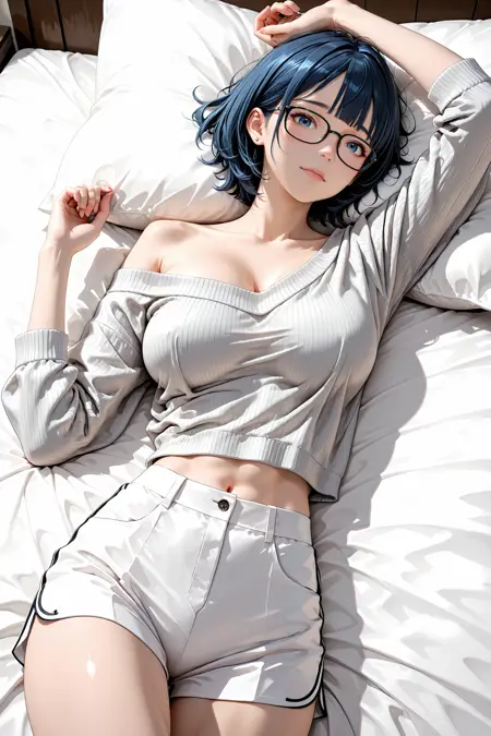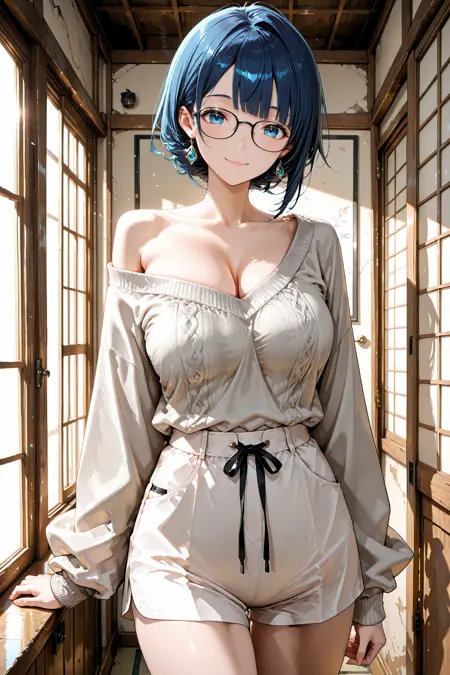 You'll probably also want to prompt "blue hair, grey sweater" if you want to get the outfit and hair more consistent.