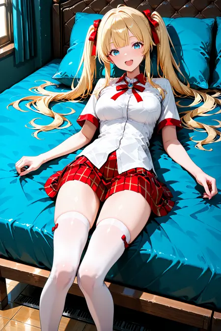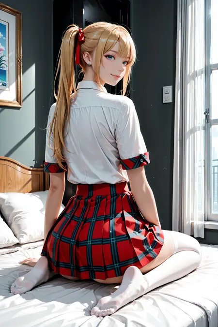 如果你想更一致地呈现服装和发型,建议在提示中加入“金发、红裙、格子裙、白色过膝袜、短袖”。