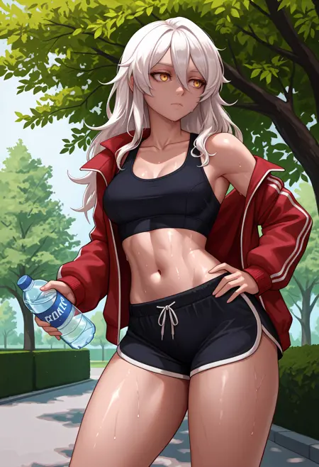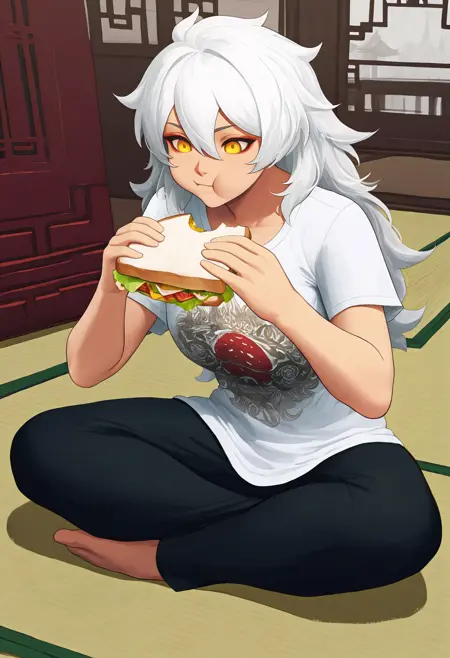 외모: 긴 머리, 흰 머리, 눈 사이의 머리, 노란 눈