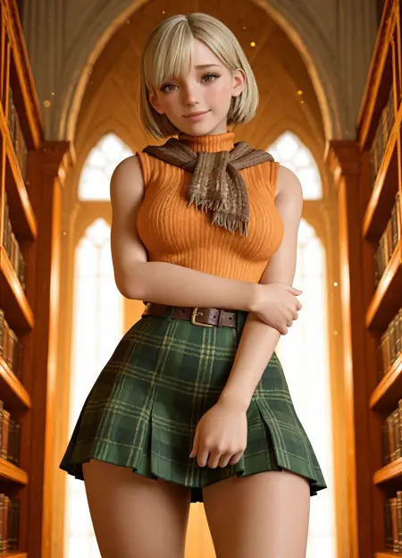 ashley112,金发,短裙,过膝长靴,无袖,短发,高领,绿色超短裙,腰带,无袖高领,浅橙色衬衫,榛子色眼睛,