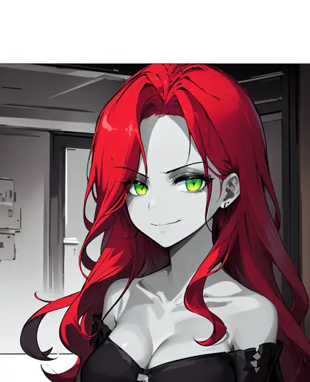 彼女のメイントリガーワードはms jin hillaで、関連する追加タグには:非常に長い髪、緑の目、グレーの肌、分け目のある前髪、光る目、赤い髪があります。