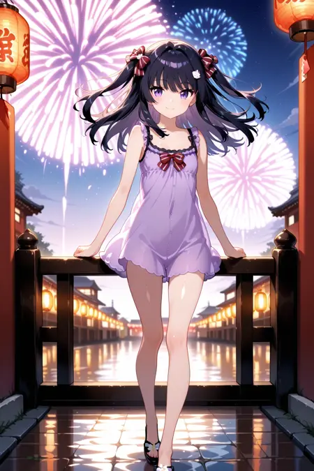 nightgown, purple pajamas. purple dress, bare shoulders, sleeveless dress, frills, red bow, striped bow