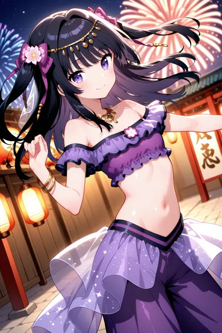 magical dress, arabian clothes, bare shoulders, off-shoulder shirt, purple shirt, short sleeves, harem outfit, midriff, necklace, bracelet, baggy pants, harem pants, purple pants, frilled shirt, purple skirt, sandals, veil